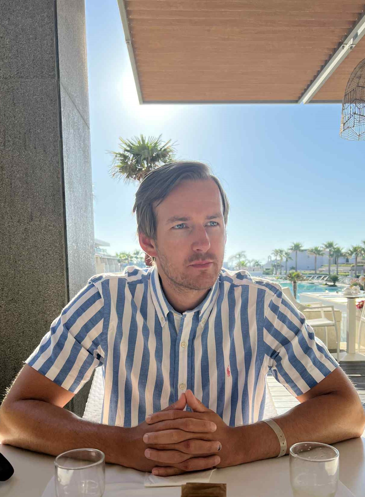 Im Urlaub ist Tormod gerne ernst. Tormod hat einen guten Geschmack bei Sommerhemden.